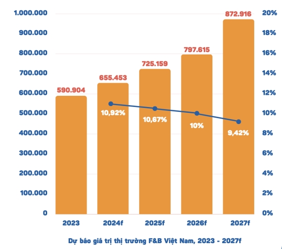 Theo số liệu của tổ chức nghiên cứu thị trường Euromonitor, giá trị thị trường ngành F&B Việt Nam năm nay dự kiến sẽ tăng 10,92% so với 2023. Sau khi hồi phục và tăng trưởng mạnh mẽ, ngành F&B sẽ tiếp tục phát triển với tốc độ tăng trưởng kép giai đoạn 2023-2027 đạt 10,25% và dự kiến đạt giá trị 872.916 tỷ đồng năm 2027.